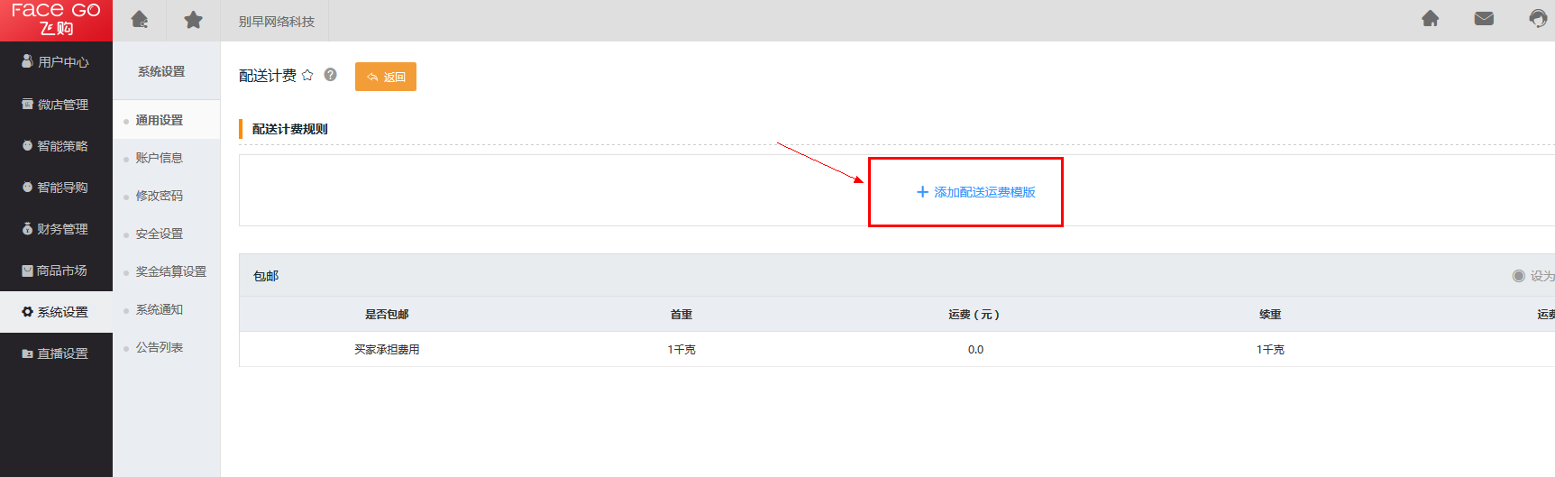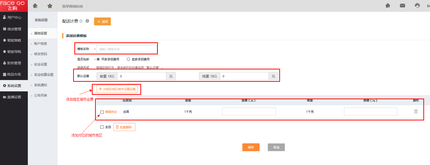 进入系统设置 -> 通用设置 -> 配送计费 -> 添加配送运费模版