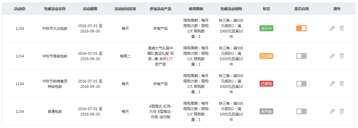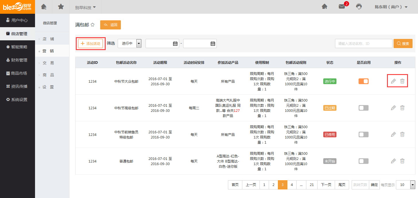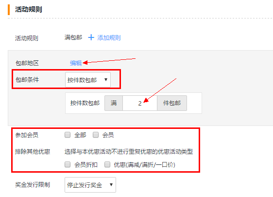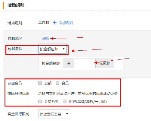 点击【满包邮】,点击【添加活动】创建一个优惠活动,或者在已经创建的基础上【编辑】本次活动信息,如下图: