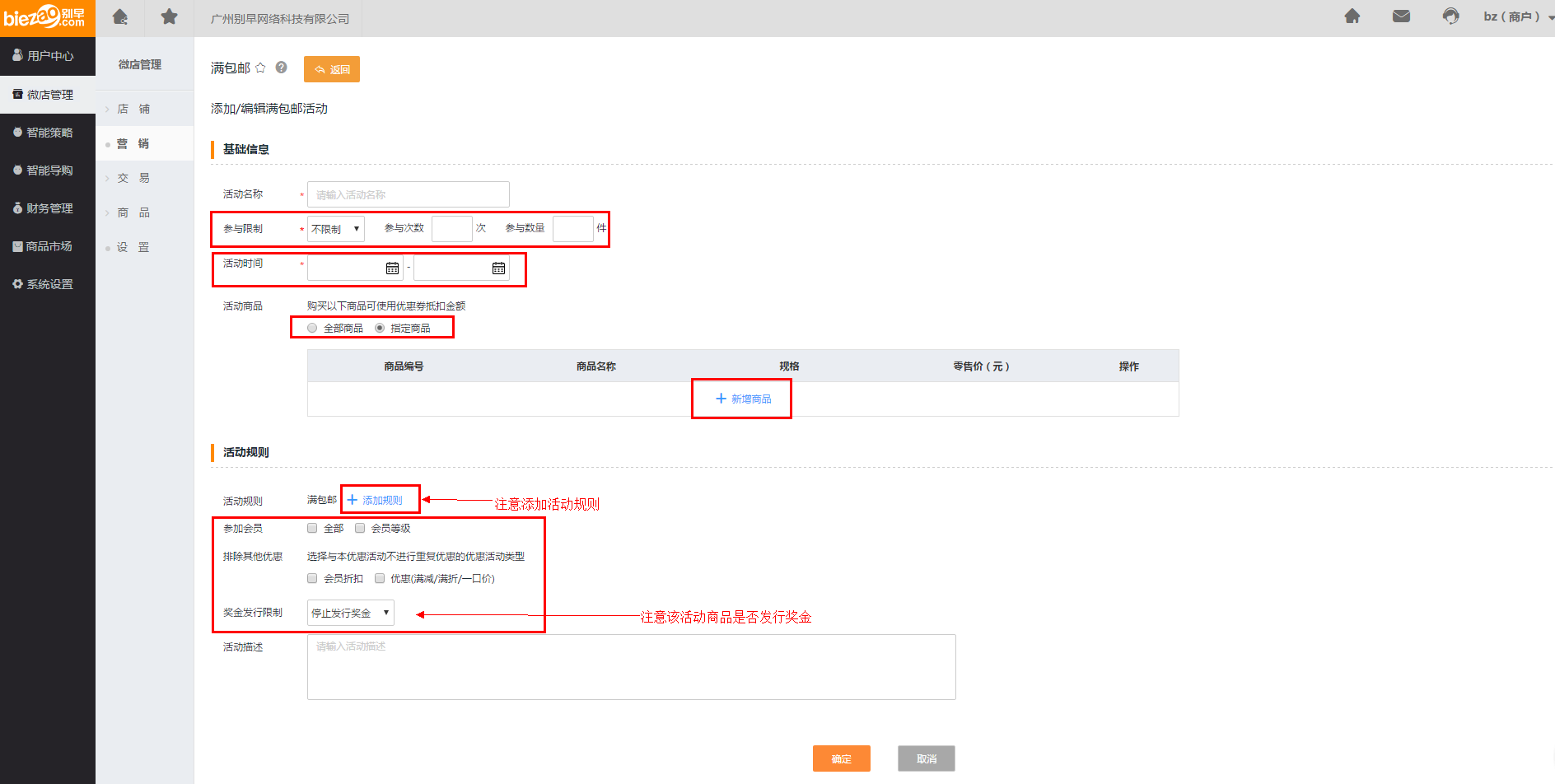 选择【全部商品】或者【指定商品】,填写相应的活动信息及活动参与的会员类型、规则,点击确定完成,如下图: