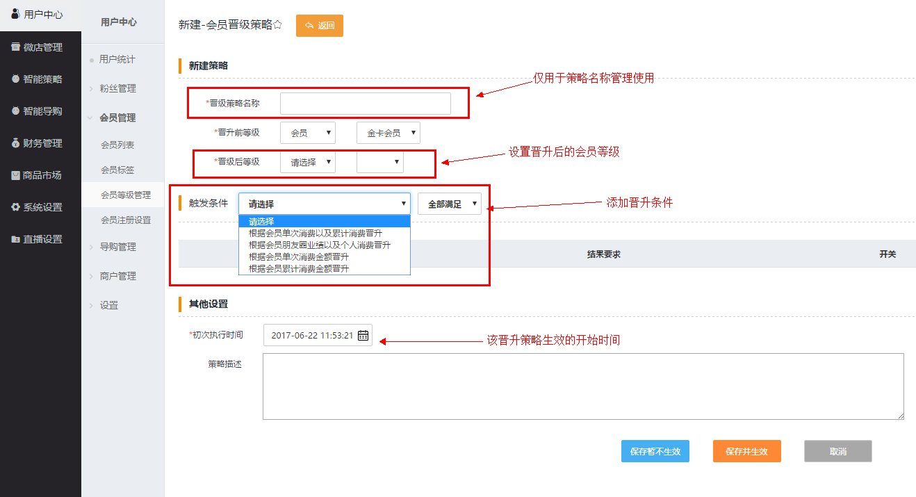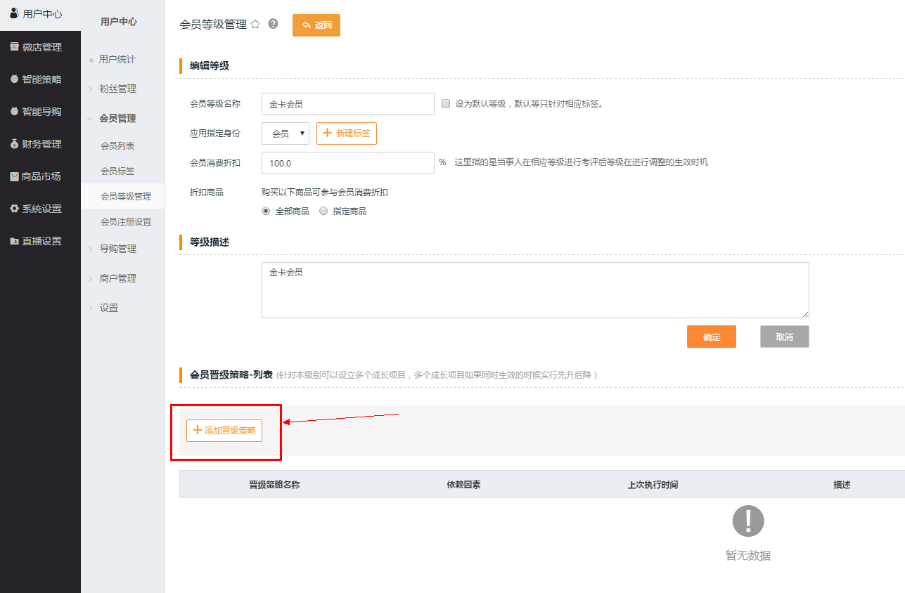 第一步 编辑 -> 添加晋级策略:添加该会员等级晋升到另外一个等级的晋升条件