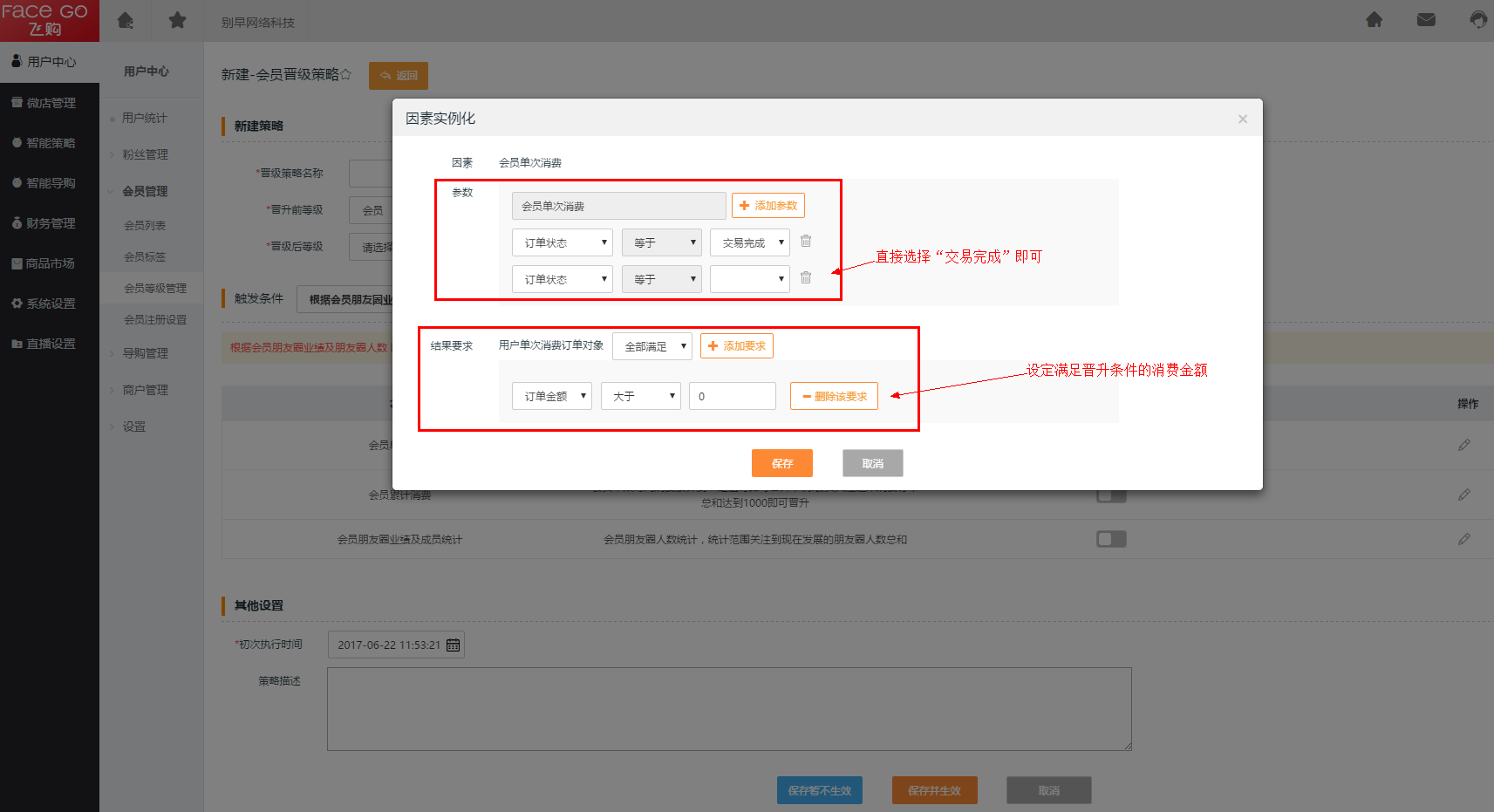 设置订单状态【交易完成】是指用户需要将订单完成后,该晋升策略才启动