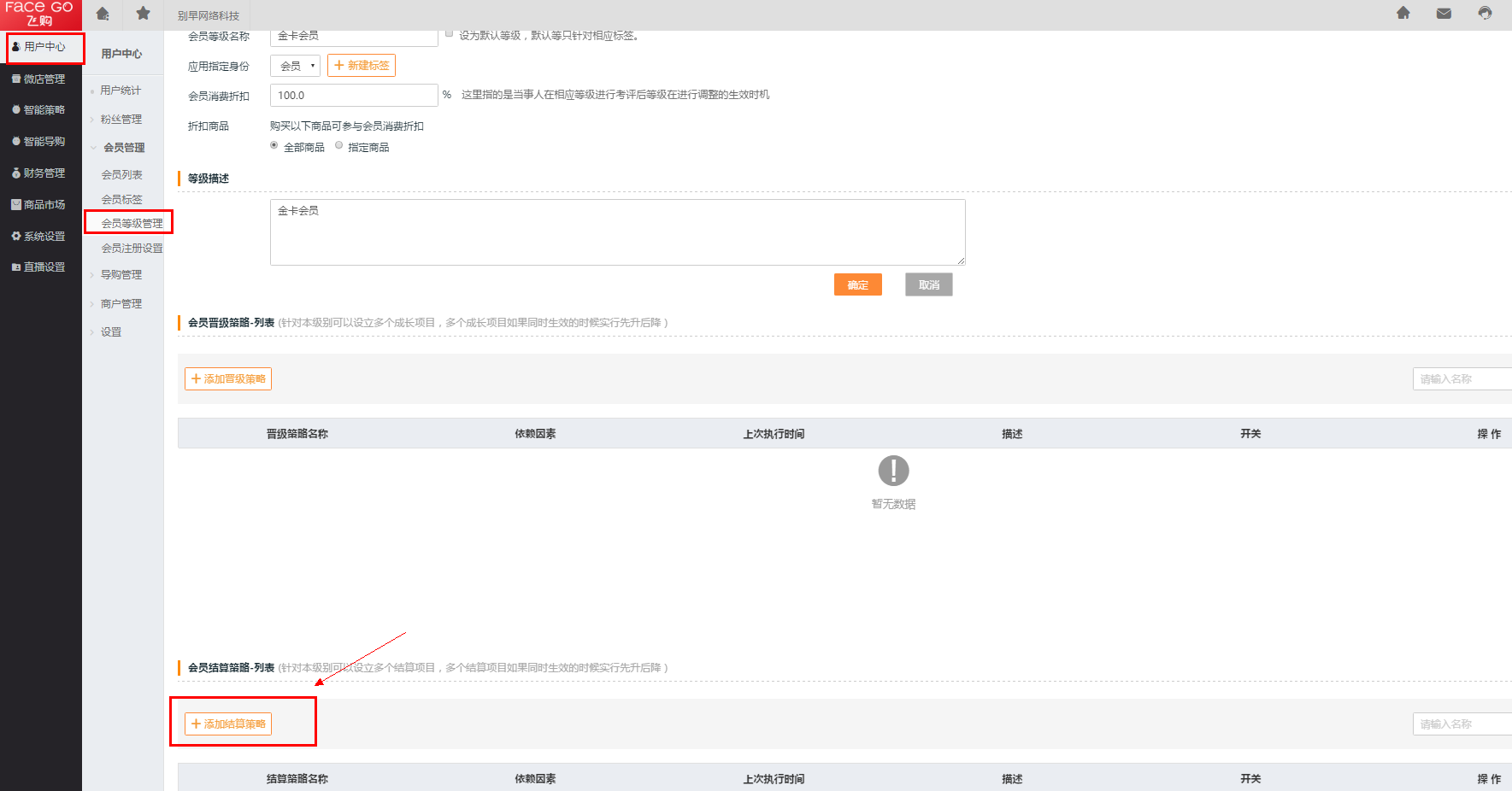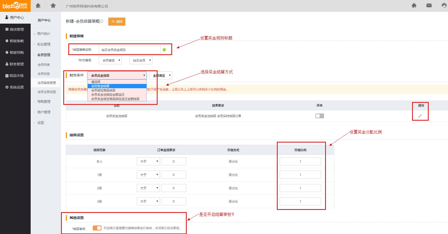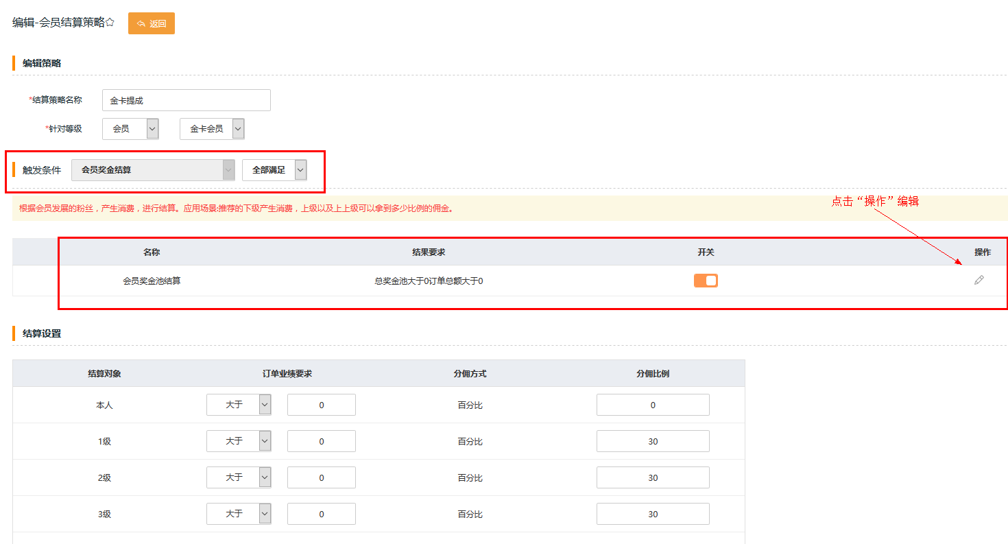 第二步 会员奖金设置:同样在会员等级对应的编辑页面 -> 添加结算策略