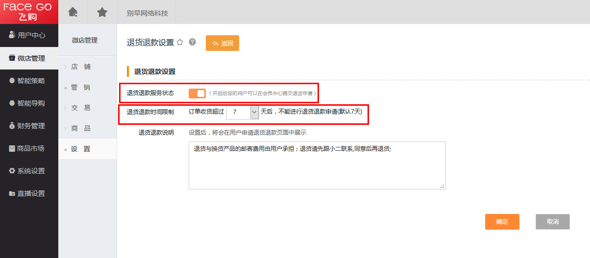 第一步 进入退款退货设置页面,操作路径:微店管理 -> 设置 -> 退货退款设置。