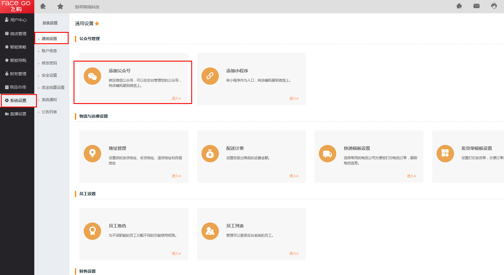 第一步 系统设置 -> 通用设置 -> 添加公众号