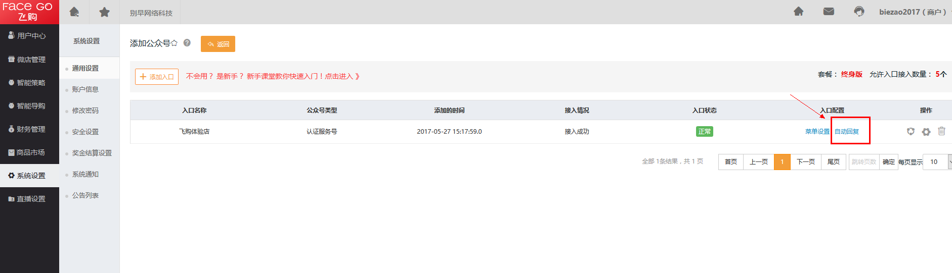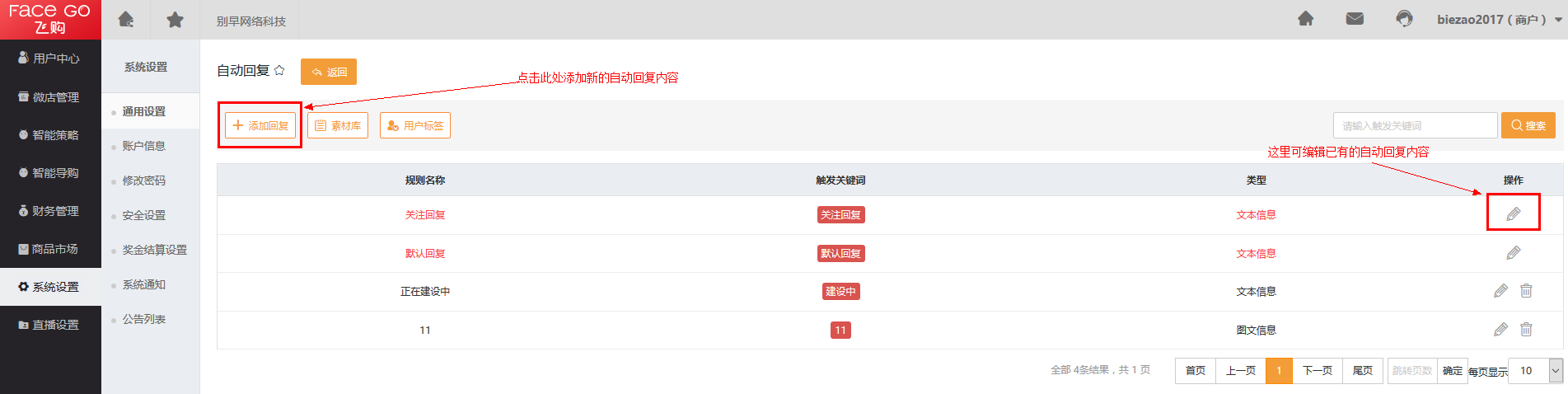 登陆Face go后台 -> 系统设置 -> 通用设置 -> 添加公众号 -> 自动回复 -> 添加回复