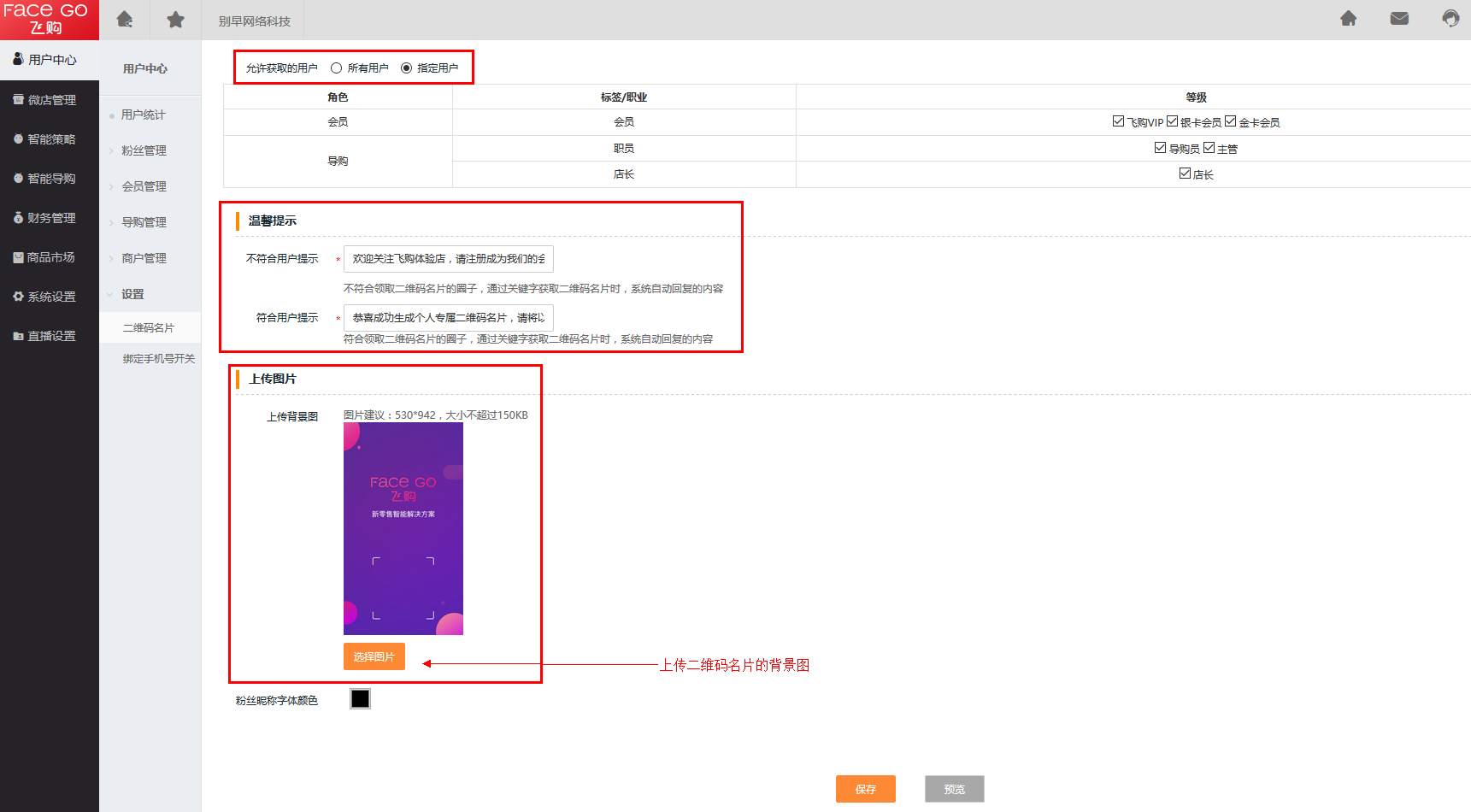 第一步 上传二维码名片背景图并设置二维码名片的获取权限;