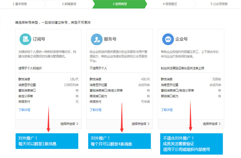 第三步 了解订阅号、服务号和企业号的区别后,选择想要的帐号类型;