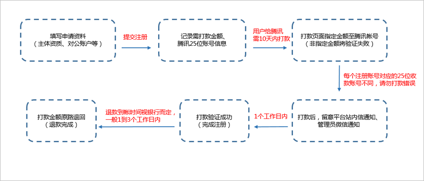 支付验证注册,每个公众号汇款金额不一致,且我司收款账号是由25位数组成,前面15位数为固定数字,后面10位数为帐号唯一识别随机码,只有汇款金额、打款账户、收款信息完全一致才可以验证成功。