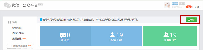 登录公众平台首页会弹出来信息提示您“去验证”,点击去验证即可显示打款信息页面。