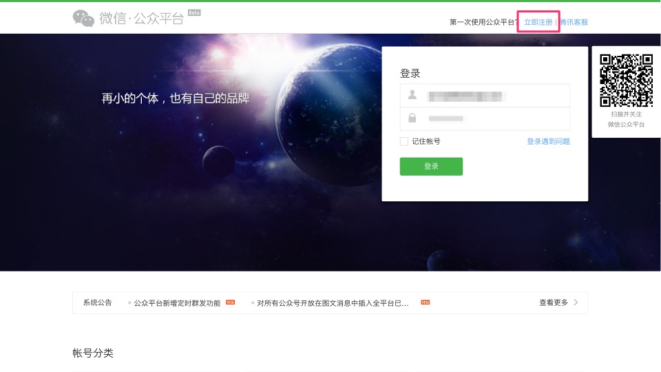 第一步:在微信公众平台右上角点击“立即注册”。