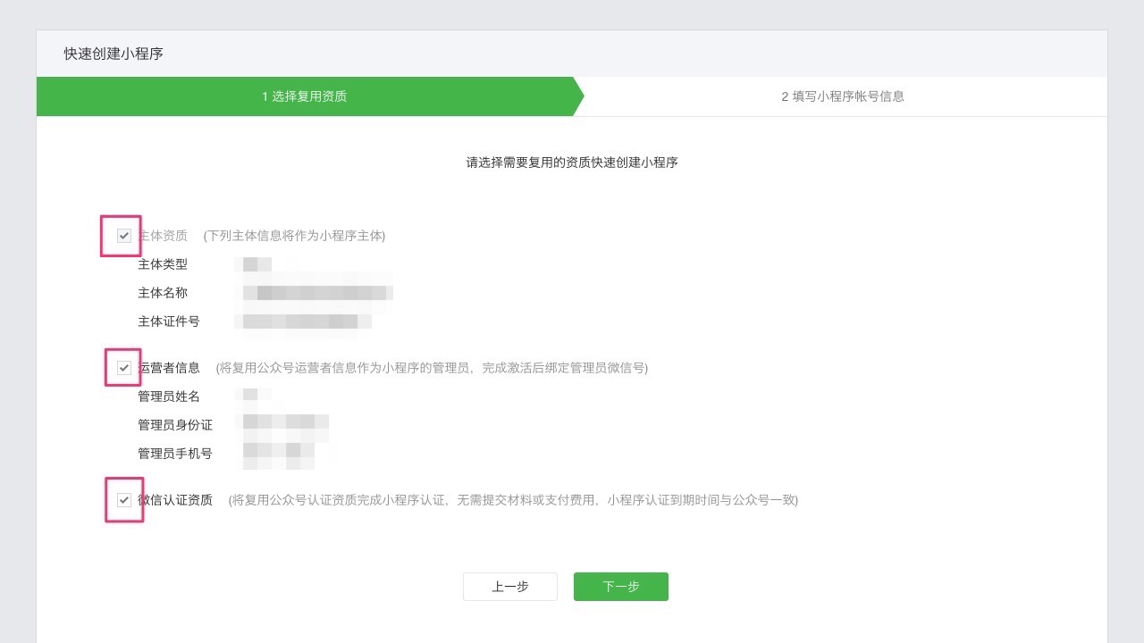 第四步:勾选所需的复用资质、信息,进入下一步 。