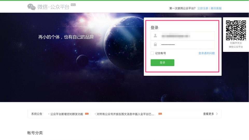 第一步:进入微信公众平台官方网站(https://mp.weixin.qq.com),登录公众号账号。